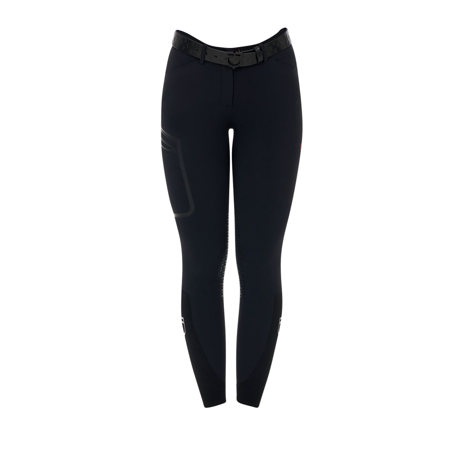The Equestro Ridertechnology collection women's breeches are made of bi-elastic and breathable technical fabric with heat-sealed seams, representing one of the main strengths of the collection. This particular fabric offers a flawless fit and adapts perfectly to the body shapes.The main distinctive element of these breeches is the silicone polka dot full grip positioned on the inside of the knee, guaranteeing exceptional adherence to the saddle. The grip is made in tone-on-tone shades, emphasizing the distinctive bright red of the Equestro Ridertechnology logo. This item also features two front pockets and an elastic side pocket for added convenience. The aesthetics are enriched by the presence of the Equestro logo and the Equestro Ridertechnology lettering on both the front belt loop and the front pocket.