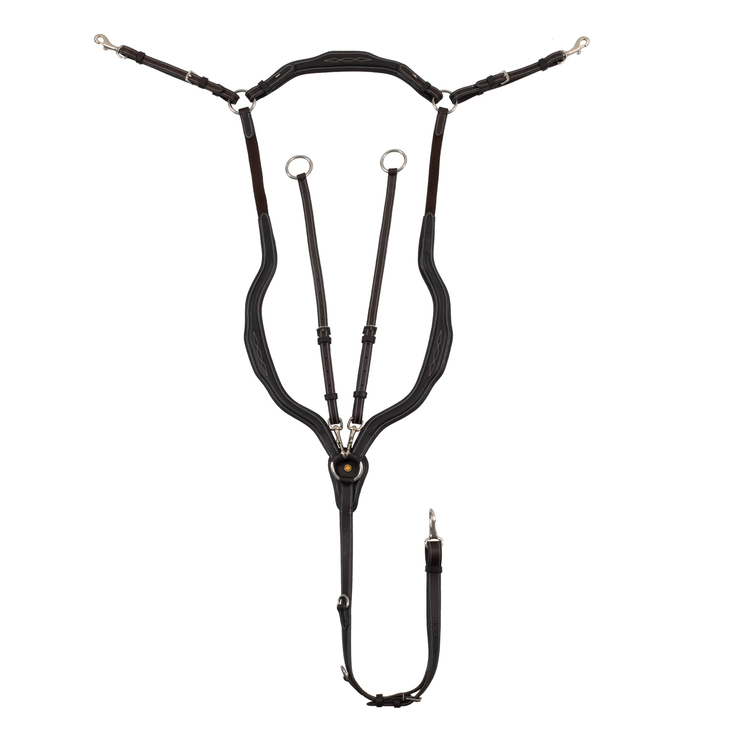 This high-quality leather breastplate prevents the saddle from sliding backwards using stainless steel hooks that attach directly to the saddle cams.