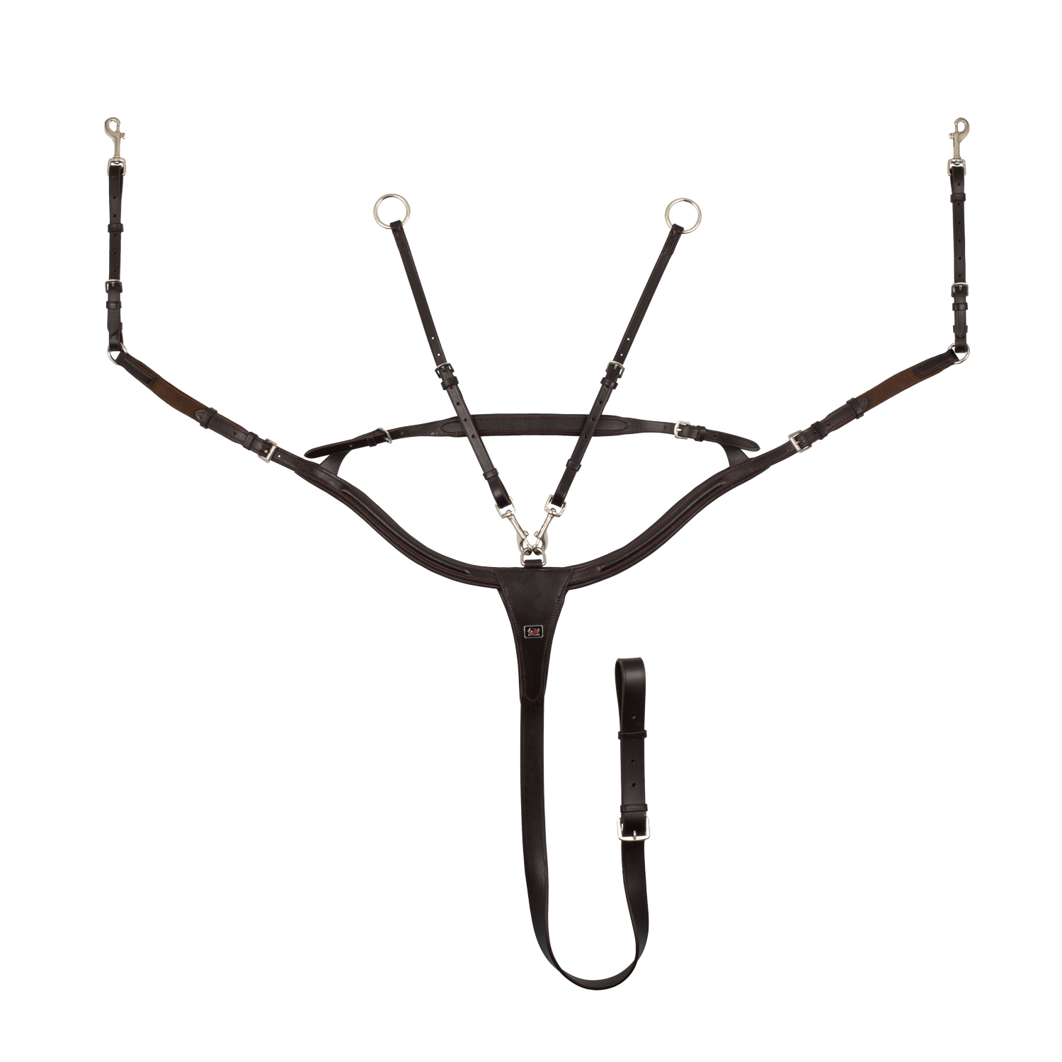 Pettorale anatomico imbottito in cuoio con ponte e forchetta removibile. Limita i movimenti della sella e della testa del cavallo.
