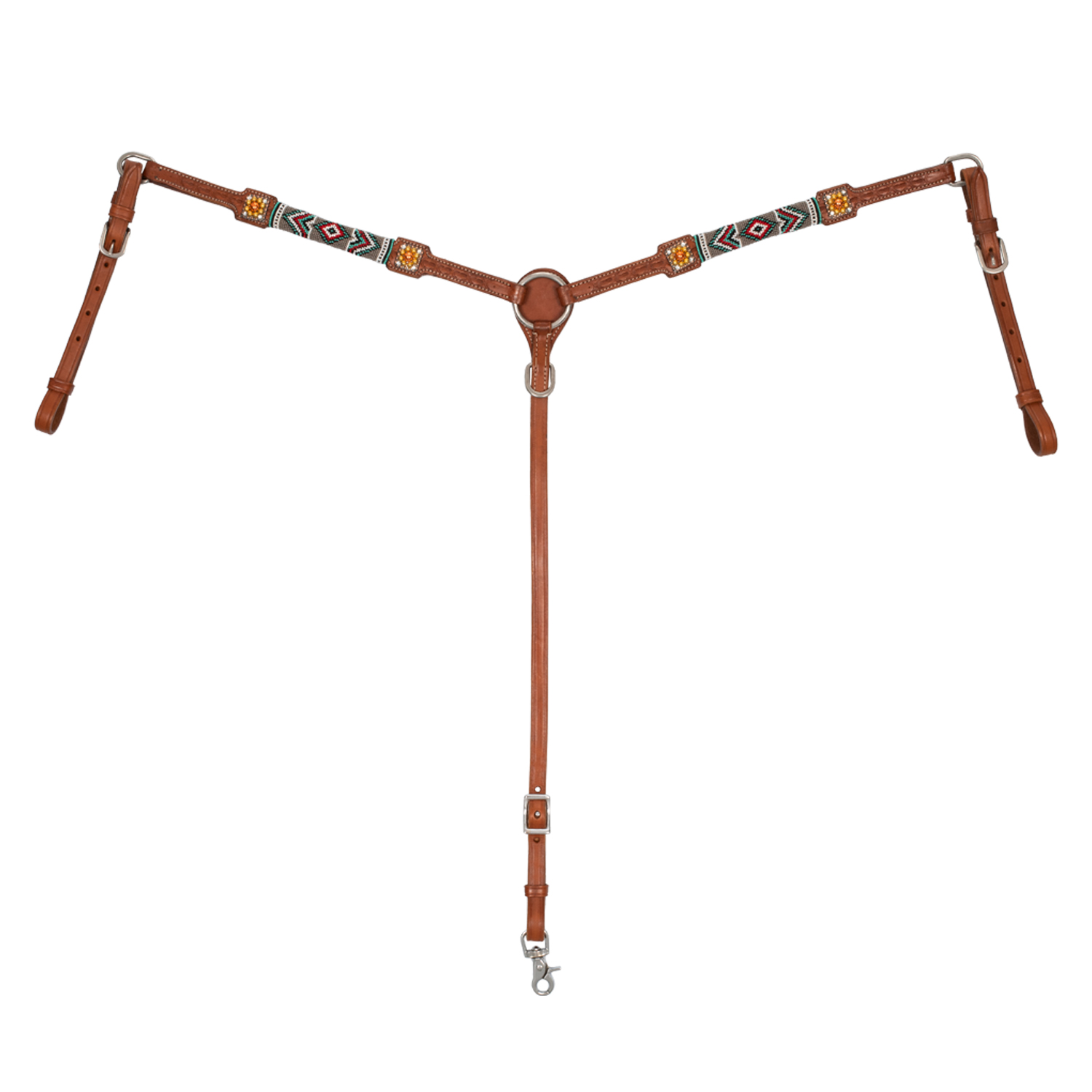 Pettorale western in cuoio di alta qualità decorato con perline decorative in stile Navajo , realizzato con fibbie in acciaio inox per una massima durabilità e resistenza nel tempo. Il pettorale è inoltre dotato di riscontri laterali e aggancio per il sottopancia.
