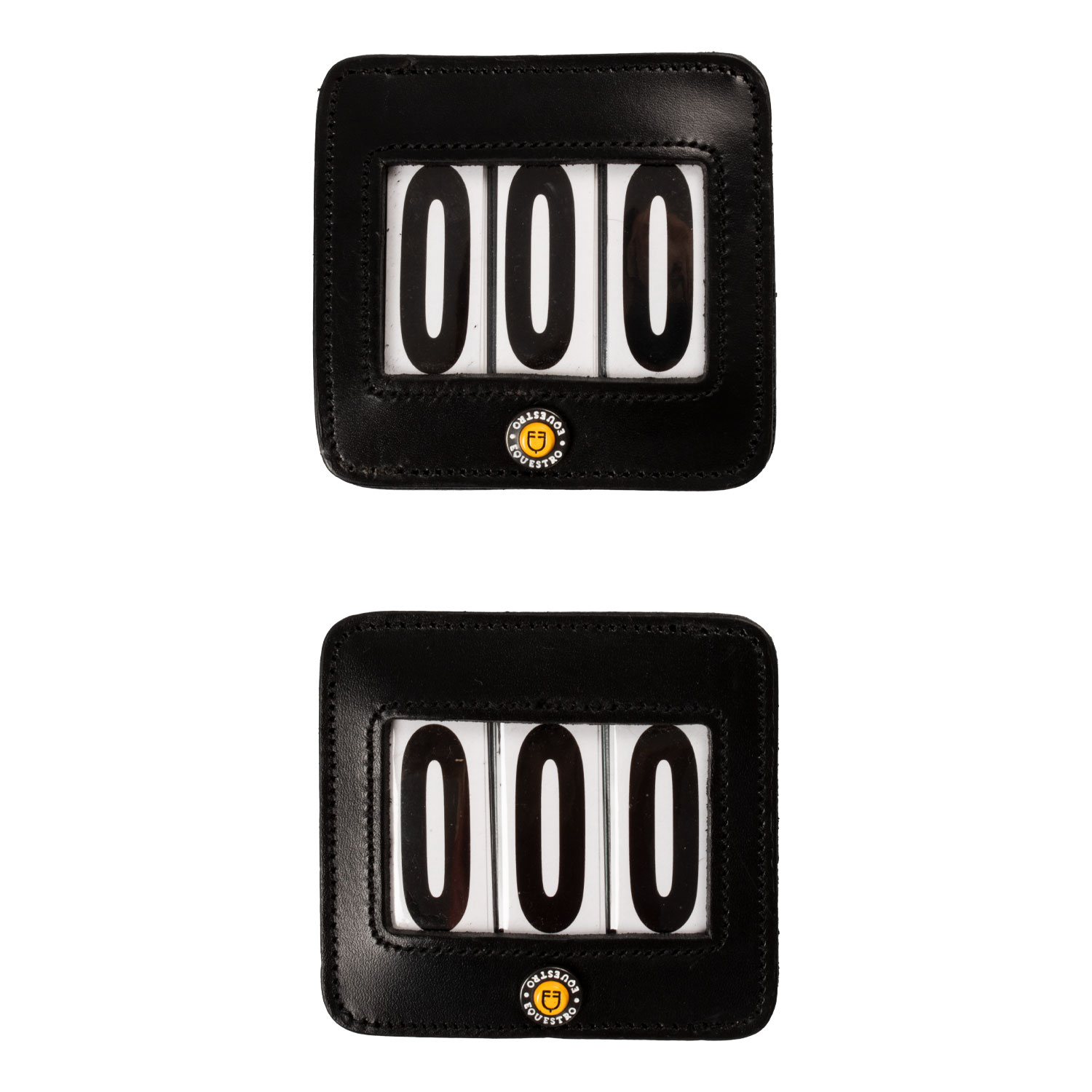Porta numeri da gara realizzato in cuoio di alta qualità e plastica trasparente, decorato con logo Equestro. Pensato per portare numeri fino a tre cifre.