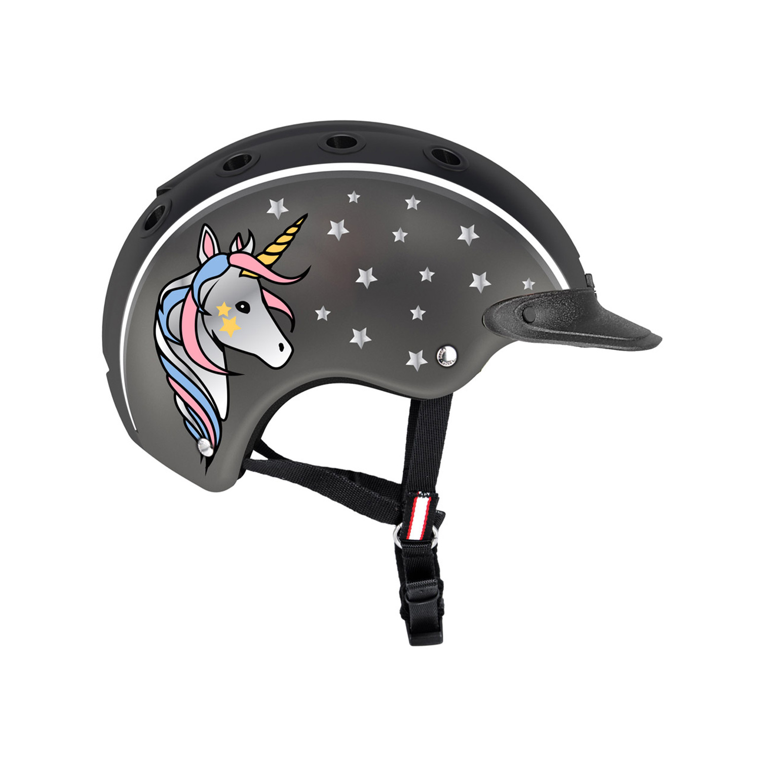 Cap "CASCO" modello Nori Casco da bambino modello Nori omologato sullo standard VG1dal peso molto ridotto e dal design speciale studiato appositamente per i bambini Ottima ventilazione e regolabile con rotella posteriore Cap adatto sia come protezione per equitazione sia come protezione per ciclismo Sistema con ruota per regolare la misura del casco Il cap è conforme al regolamento della direttiva europea VG1 per le attrezzature di protezione individuale Fresh air ventilation, il cap presenta un sofisticato sistema di ventilazione all'interno della calotta Massima protezione con il minimo peso solo 310/360 g Scocca e fodera sono uniti in un singolo elemento Chiusura Cord Strapping sistema che permette a chi indossa il casco di regolare la misura del laccio sotto gola in pochi secondi, senza togliere il casco stesso.