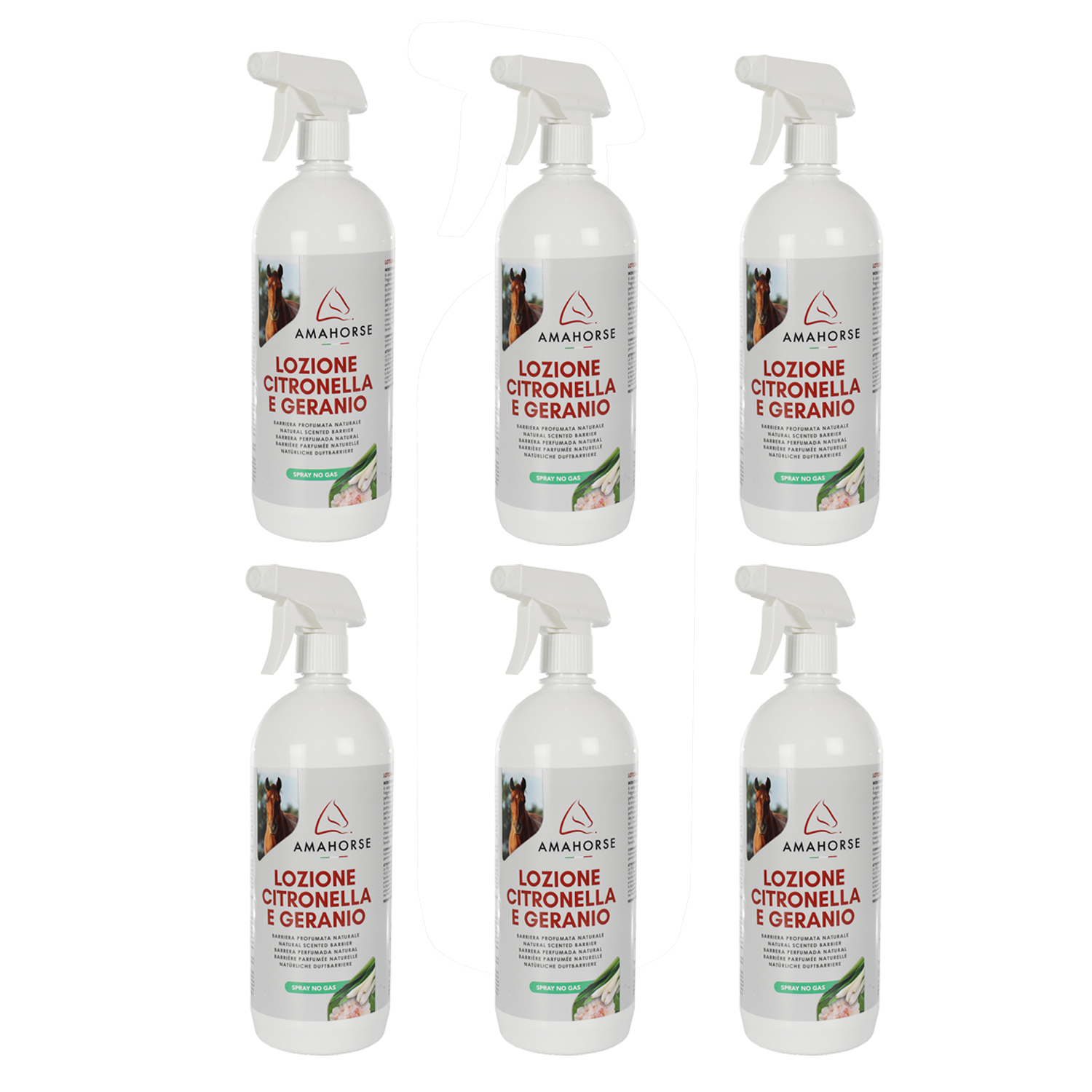 Lozione Citronella e Geranio: spruzzata in leggere quantità sul cavallo, grazie alla presenza di olii concentrati di citronella e geranio aiuta a tenere lontano gli insetti