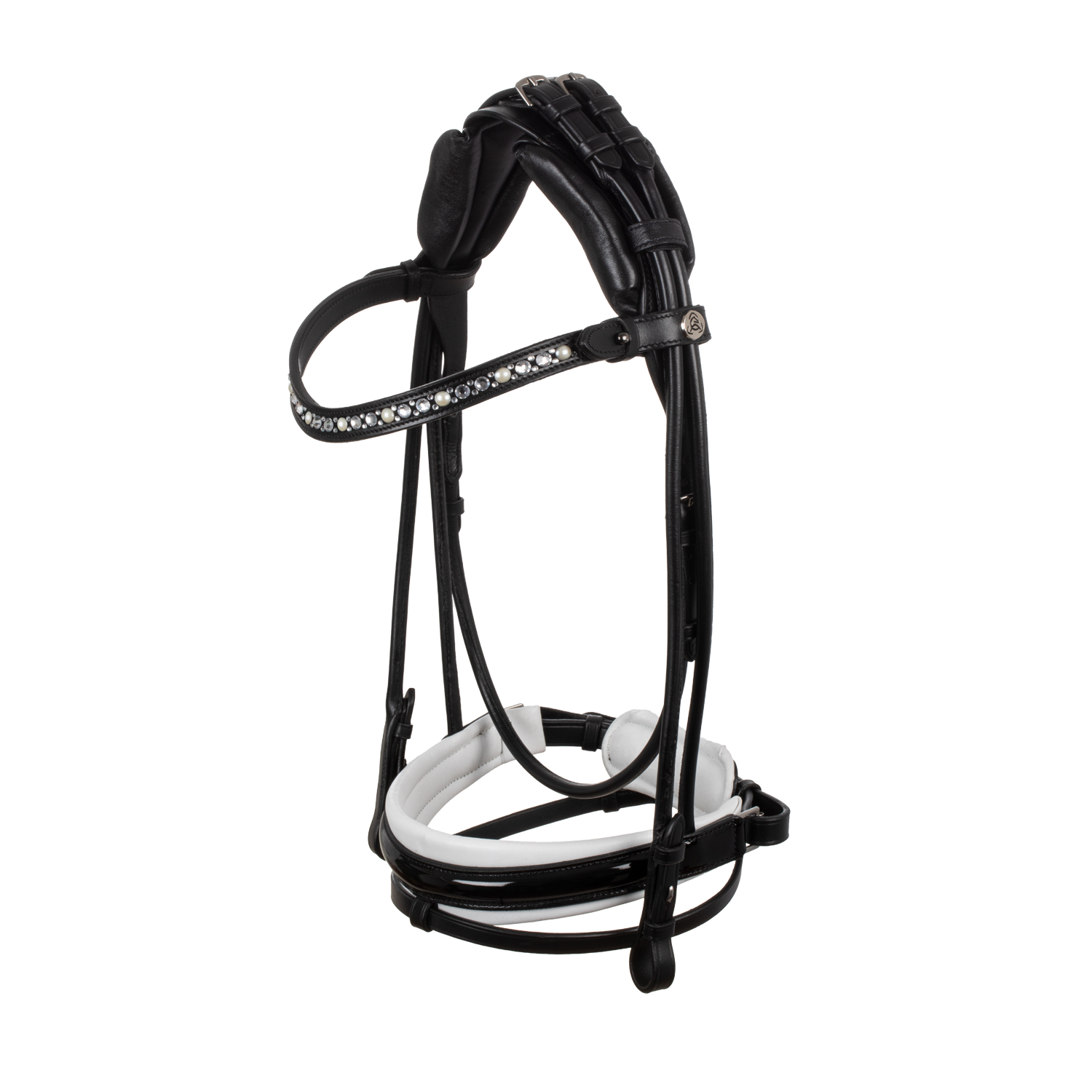 Il frontalino elegante è caratterizzato da brillantini bianchi, aggiungendo un tocco di lusso e sofisticazione. La regolazione si trova sul sopracapo, conferendo alla testiera un aspetto elegante e pulito.