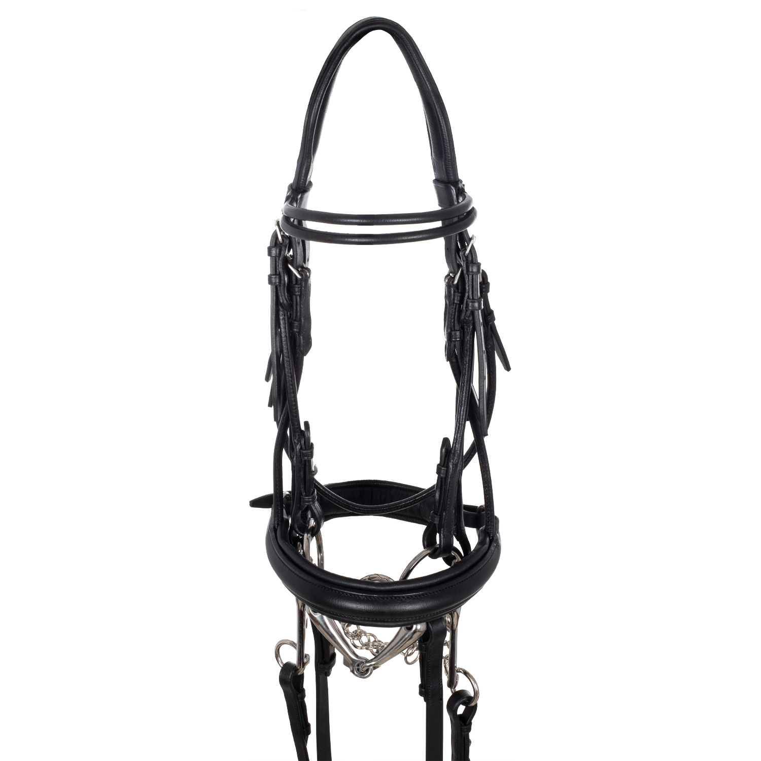 Briglia inglese sagomata e realizzata in morbido cuoio di alta qualità con fibbie in acciaio inox per renderla ancora più resistente.
