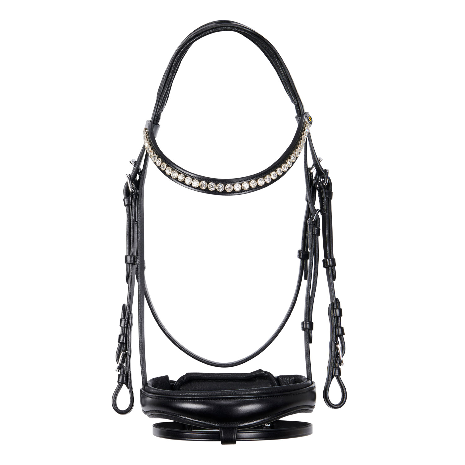 Il frontalino, anch'esso imbottito, è decorato con brillantini incastonati e una placchetta metallica con logo Equestro.
