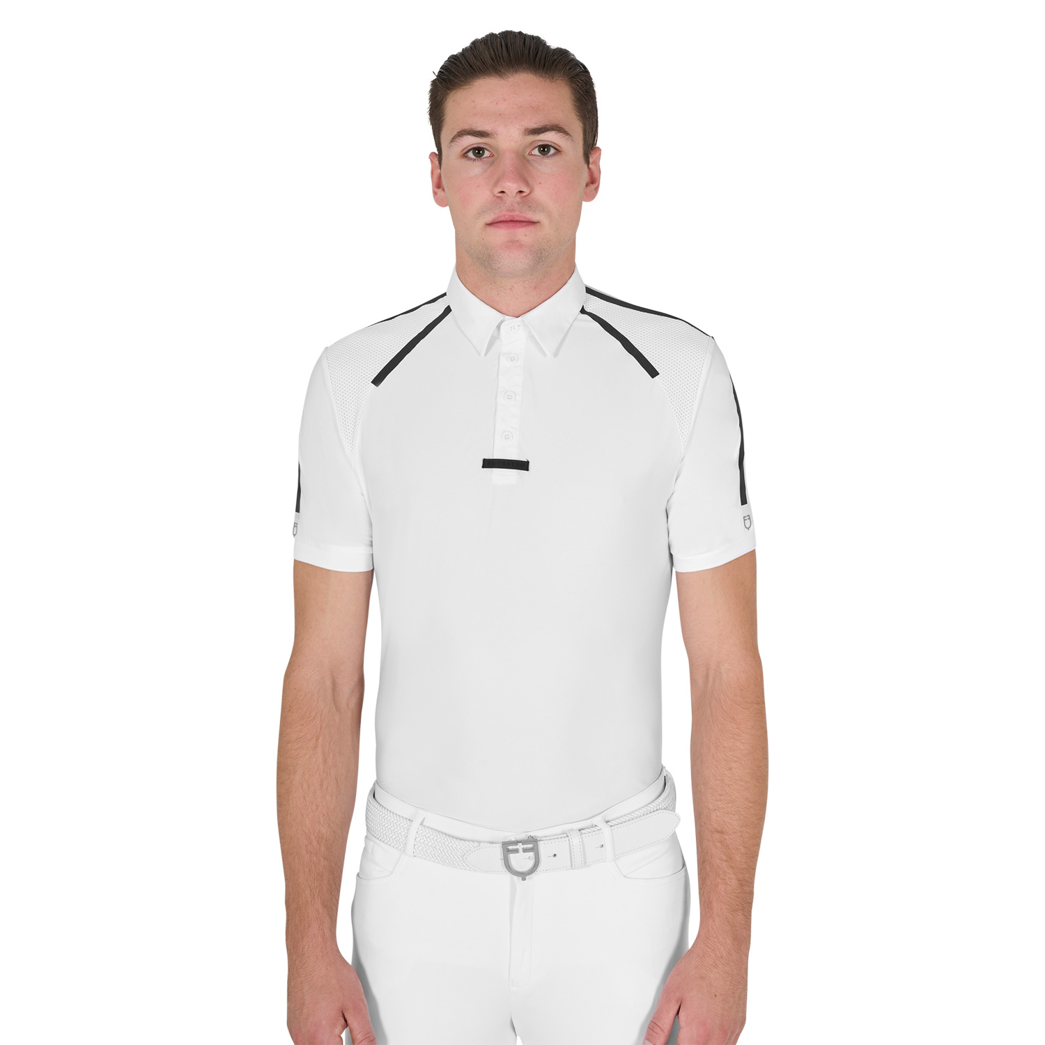 Il capo è caratterizzato da chiusura a quattro bottoni e logo Equestro nella parte posteriore. Un ulteriore elemento funzionale è il fermacravatta in silicone, che mantiene ogni dettaglio al suo posto anche durante le attività più dinamiche.
