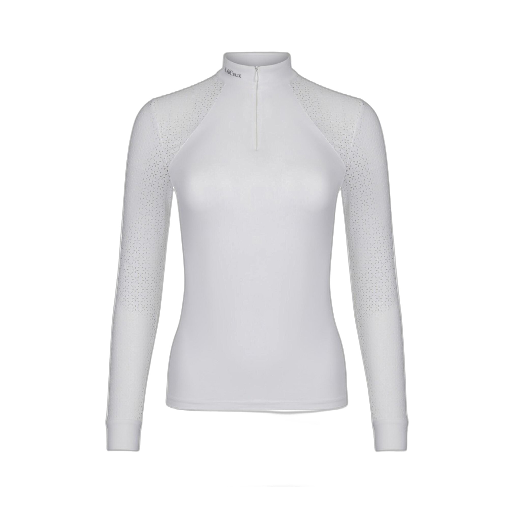 Una chiusura frontale con zip invisibile mantiene la camicia elegante. La camicia è rifinita con un colletto bianco con dettaglio borchiato LeMieux.