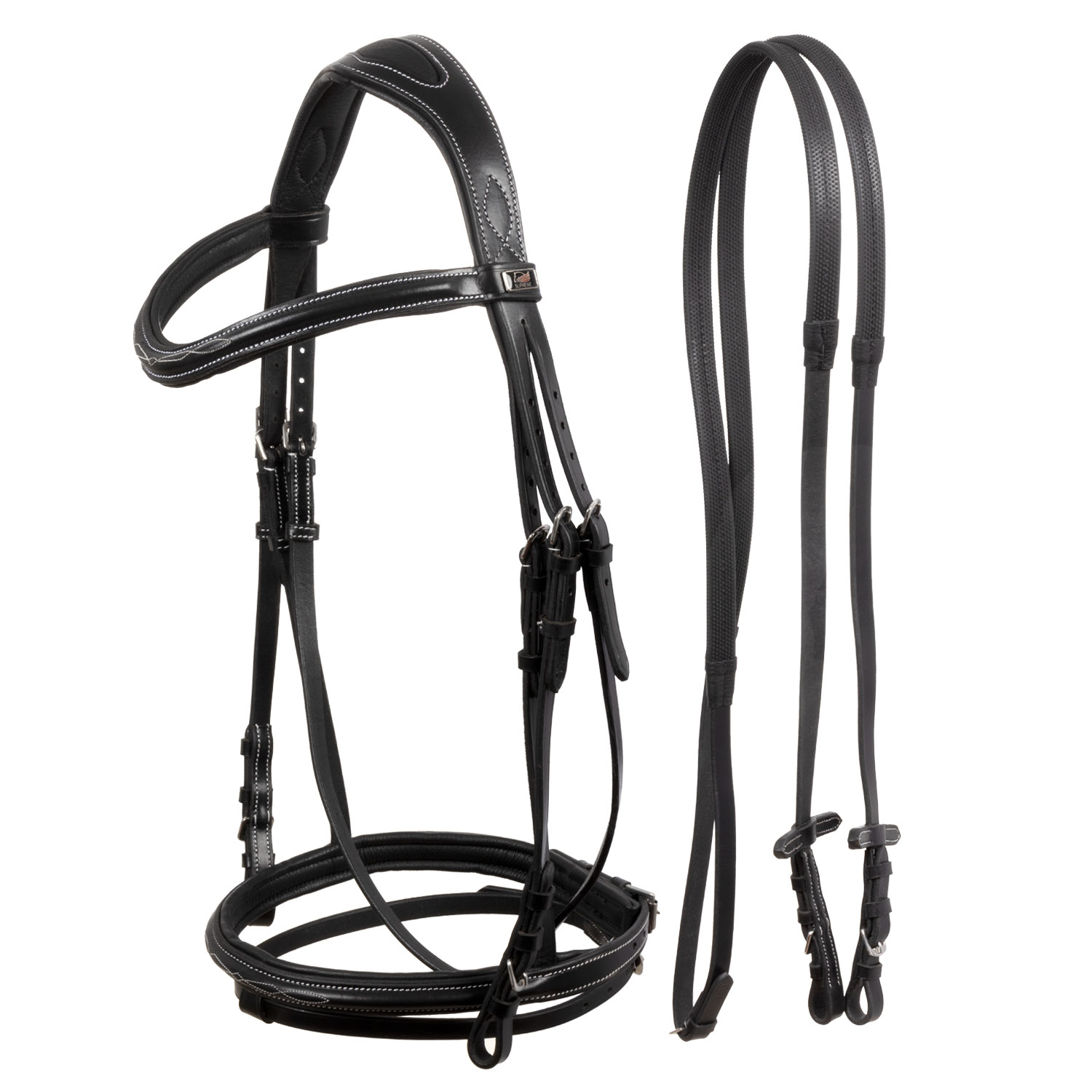 Testiera inglese in cuoio superiore, frontalino con cuciture bianche, completa di redini in gomma